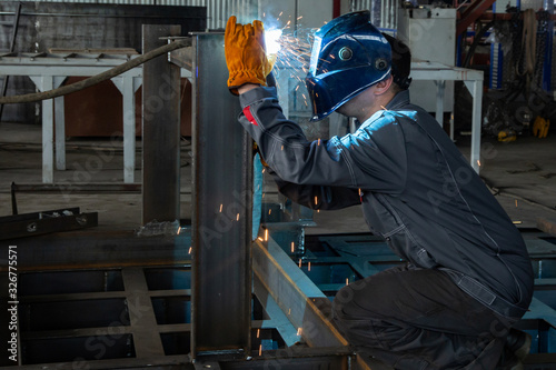 Worker while doing a welding with arc welder