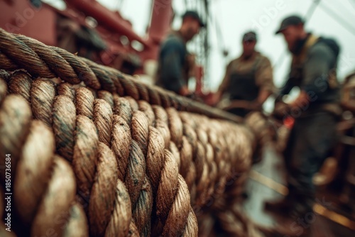 Workers handle thick ropes on a fishing vessel during early morning hours at sea in a cloudy setting
