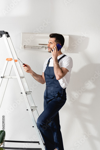 workman talking on smartphone and holding screwdriver on stepladder near air conditioner