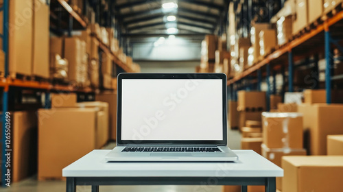 Workspace featuring a laptop on a table in a spacious warehouse setting