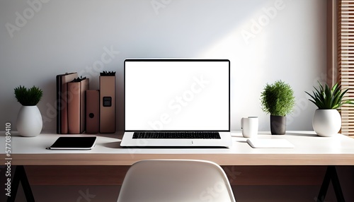 Workspace table with laptop computer mockup table. Close-up tabletop workspace. Generative AI.