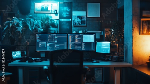 Workspace with Multiple Computer Screens Displaying Code in a Dim Room