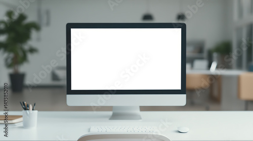 Workstation setup featuring a desktop computer with a blank screen. Perfect for showcasing software, websites, or digital content in a modern office environment.