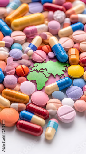 World map surrounded by various pills and capsules