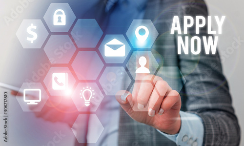Writing note showing Apply Now. Business concept for An act of a demonstrating to acquire the job related to the profession