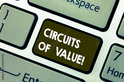 Writing note showing Circuits Of Value. Business photo showcasing system is being designed with central goal using offchain Keyboard key Intention to create computer message pressing keypad idea