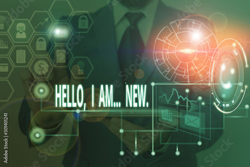 Writing note showing Hello I Am New. Business concept for introducing oneself in a group as fresh worker or student Picture photo network scheme with modern smart device