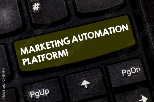 Writing note showing Marketing Automation Platform. Business photo showcasing automate repetitive task related to marketing Keyboard key Intention to create computer message pressing keypad idea