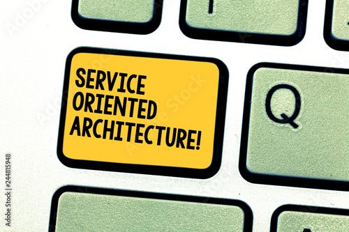 Writing note showing Service Oriented Architecture. Business photo showcasing Central interface A way of organizing software Keyboard key Intention to create computer message pressing keypad idea