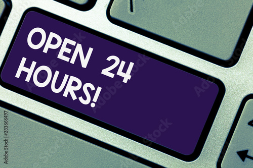 Writing note showingOpen 24 Hours. Business photo showcasing Working all day everyday business store always operating Keyboard key Intention to create computer message pressing keypad idea