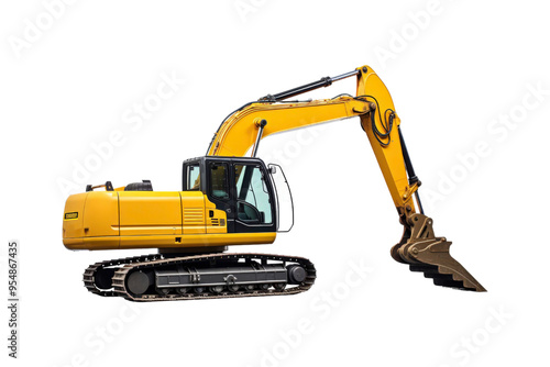 Yellow excavator with a brown bucket on the treads. Ideal for construction, industrial, machinery, engineering, and heavy equipment concepts in design projects