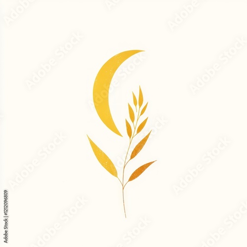 Yellow moon with golden plant on beige backdrop for nature and mystic themed projects