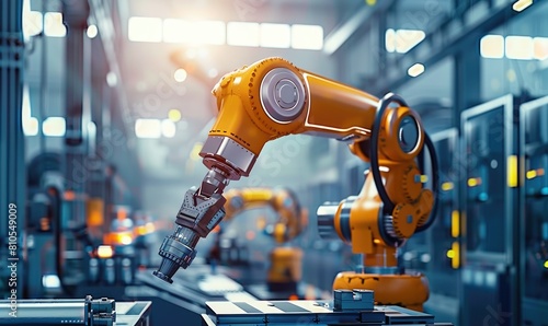 Yellow Robotic Hand Working in an Industrial Factory with Blur Background. Computer Automation Robot, Smart Technology Production, and Manufacturing Assembly Lines in Factory Environments.