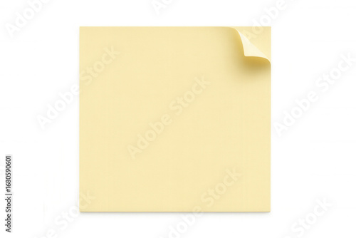 Yellow sticky note with curled edge, resting on clear surface, offering clean workspace for quick notes or memory aid