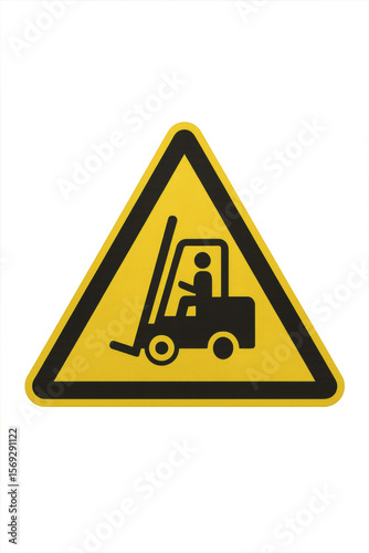 Yellow triangular warning sign showing forklift truck on transparent background