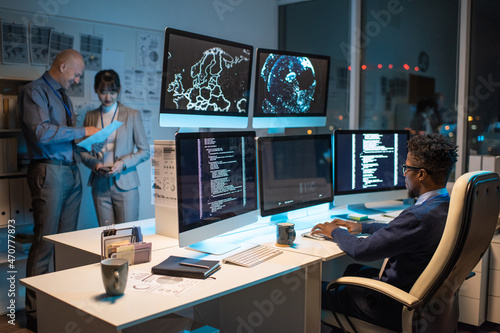 Young African businessman looking at data on computer screen while sitting in armchair in front of several monitors and typing