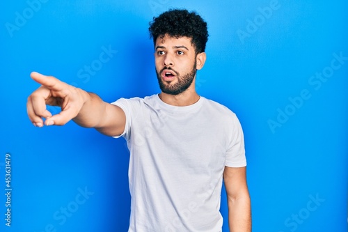 Young arab man with beard wearing casual white t shirt pointing with finger surprised ahead, open mouth amazed expression, something on the front