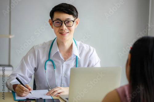 Young Asian male doctor is recording a medical history on the clipboard and explaining something to the female patient. Medical and health care concepts
