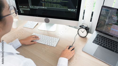 Young Asian woman Programmer Typing code working with computer at table, coding cyberspace and Web Development Concept