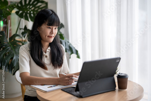 Young asian woman working from home using digital tablet and taking notes