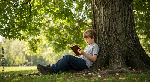 Young Boy Enjoying a Book Under a Tree in a Sunny Park