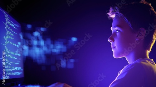 Young Boy Focused on Computer Coding in Dim Light