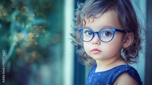 Young child wearing blue glasses focusing on distant tree outside window, symbolizing myopia prevention and importance of outdoor activities.
