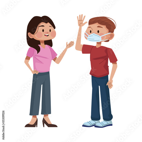 young couple using medical masks characters