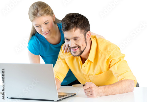 Young cute couple working together with laptop