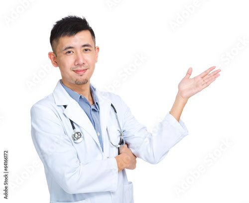 Young doctor show something by hand