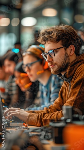 Young engineer focuses on programming advanced robotics systems in a technology-driven lab. With tools and components surrounding the workspace