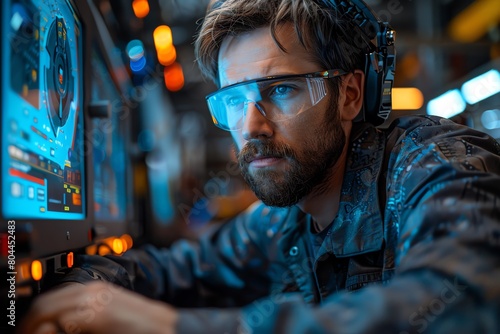 Young engineer programming CNC machine, steel gray palette, low angle, sharp artificial light,