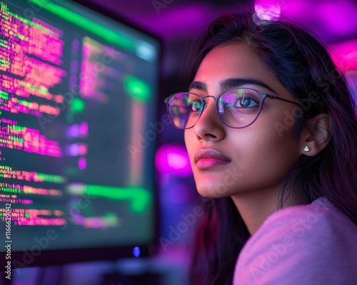 Young Female Programmer Focused on Coding in Neon Tech Environment