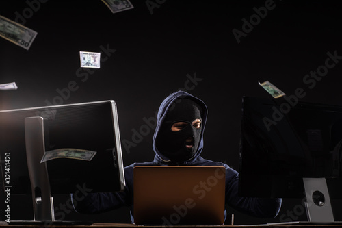 young hacker man in balaclava successfully finished hacking , sit in the hood of pullover, professional programmer male hiding face behind a mask, hack anonymously, man engaged in crime