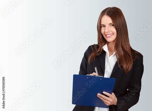 Young happy female standing holding documents