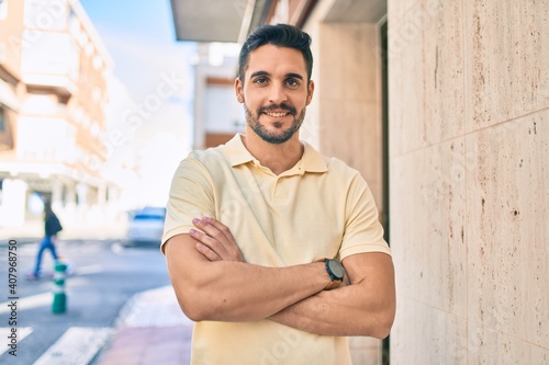 Young hispanic man smiling happy walking at the city.