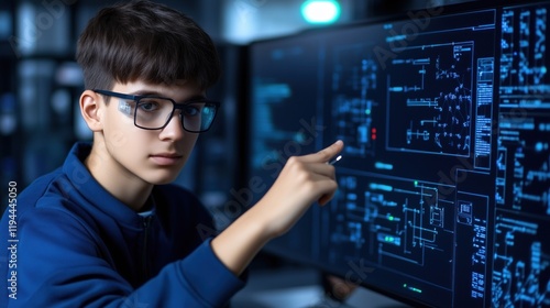 young individual wearing glasses is intensely focused on a computer screen displaying intricate coding tasks and schematic diagrams. It is a vibrant workspace filled with technology