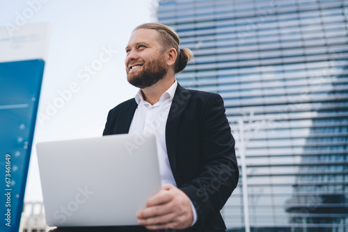 Young male employee sitting outside workplace