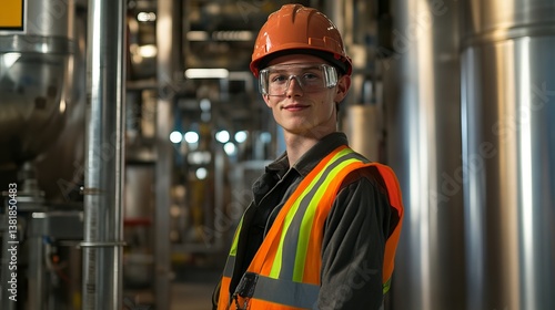 Young Male Industrial Engineer Safety Helmet Portrait Industrial Facility Setting Hard Hat Safety Glasses Reflective Vest Professional Worker