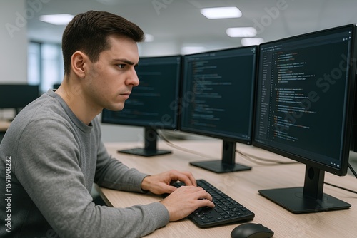 Young male software developer programming using multiple computer monitors in modern office.