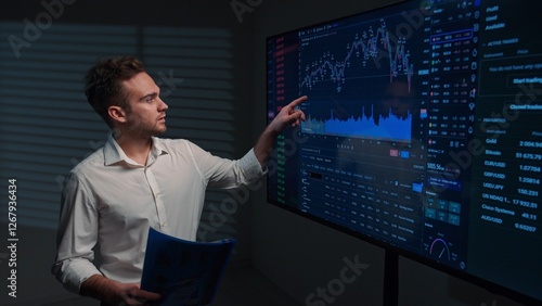 Young man broker in office boardroom analyzing financial data infographics on big display, reading report documents, looking and smiling positive.