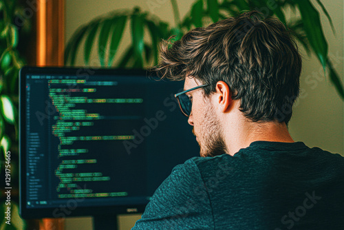 Young man coding at a computer with plants in the background.