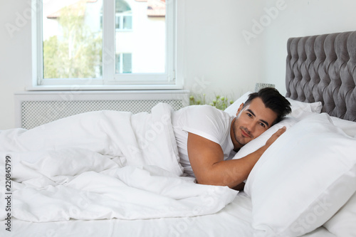 Young man lying in bed with soft pillows at home