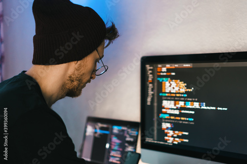 Young man mobile developer writes program code on a computer, programmer work in home office.