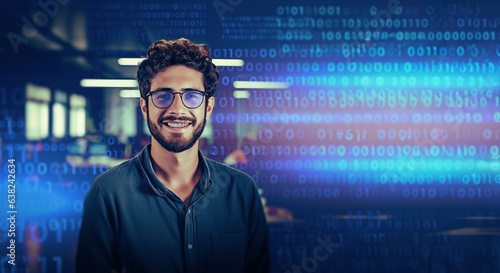 Young man programmer coding at night on ai computer screen for networking, malware or software at the office. Male person, coder or developer working late in computer display in problem solving.