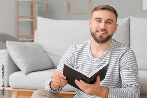 Young man reading book at home