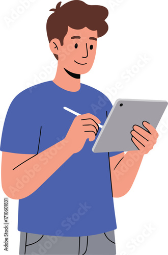 Young man using a stylus on a tablet.