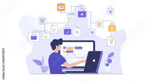 Young man working on a laptop at home, browsing online shopping platforms, exploring digital market trends, and managing virtual shopping carts and payments
