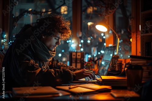 Young Man Working On Laptop At Night In Cozy Home Office