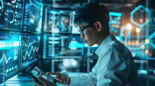 Young Mathematician Designing Algorithm on Tablet in Futuristic Office with Data Screens